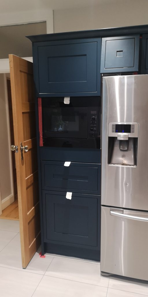 Complete degrease and dustless sanding to the units and walnut worktop. Different design of new handles and different location meant the original holes needed to be filled and sanded to an invisible finish. Unfortunately the handles were fitted by a carpenter after we had completed some weeks later, so no pics available.