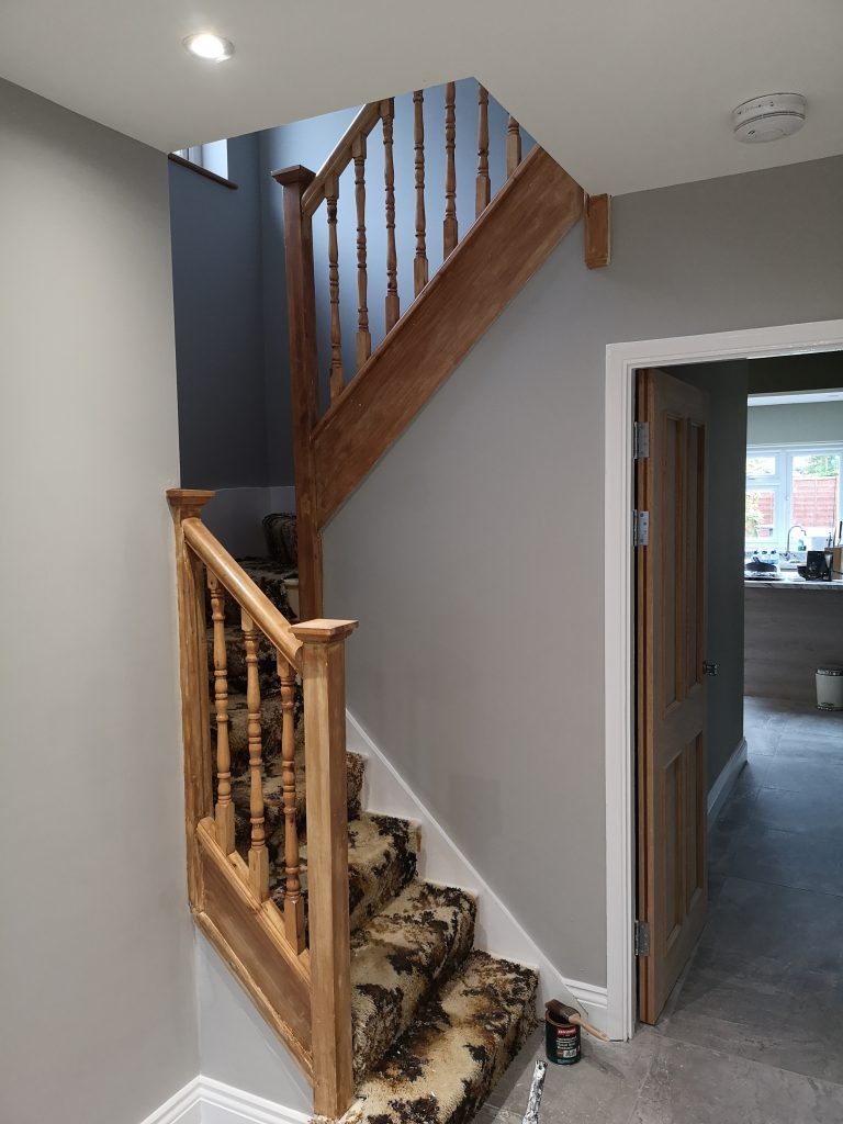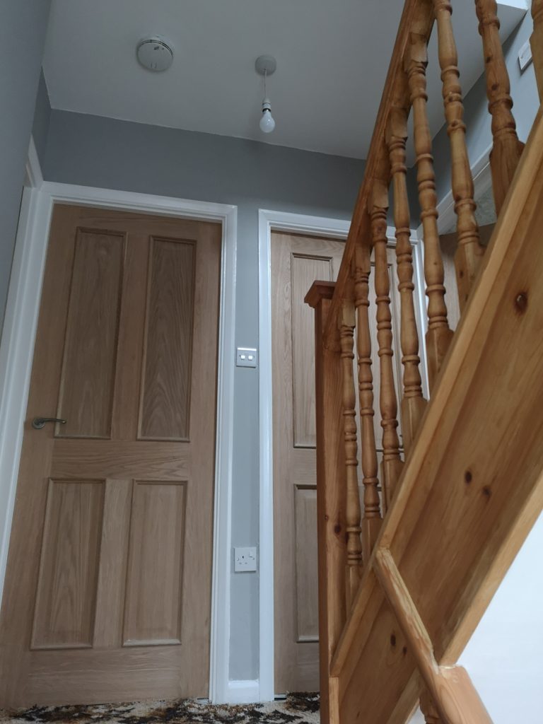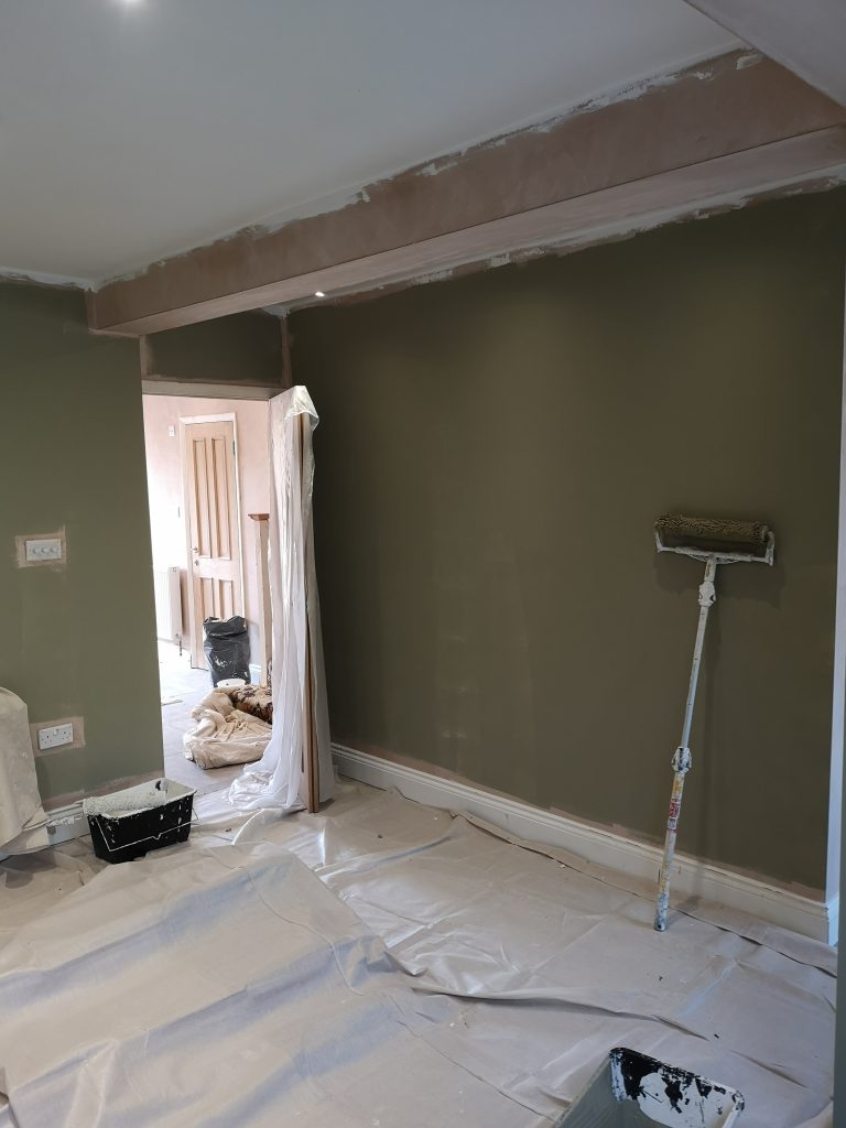 Plastered and Decoarated by us a few years ago. Johnstones durable matt tinted to Dulux Overtly Olive colour